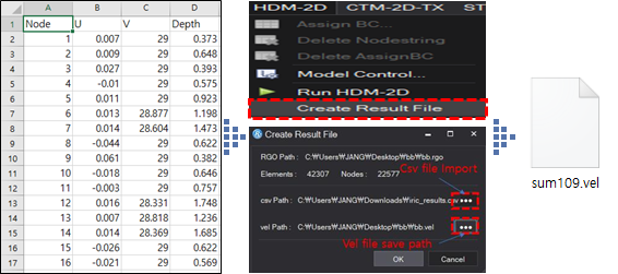 노드별 U/V/Depth 값을 가지고 있는 *.csv 파일을 이용하여 HDM-2D 엔진 수행 없이 유속장 파일(*.vel)을 사용자가 별도로 생성할 수 있는 기능을 제공합니다.